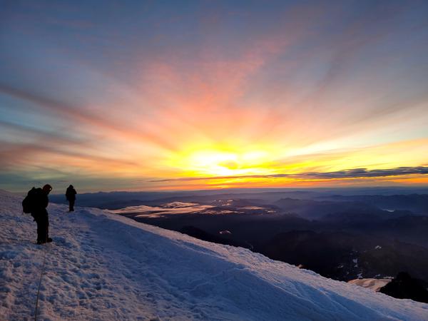 I wake up pretty early and see the sunrise. It’s magical. Also, nobody sleeps at Camp Muir. It’s like New York City, always bustling with people, even at midnight. We go to the guides’ tent (aka the kitchen) at 8 am. The treacherous trek to the tent is even worse with the 40-pound pack.